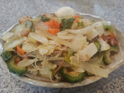 投稿日: 2025年9月20日2025年9月5日生徒さんからの頂き物・・・(‘◇’) ゴーヤーを生徒さんから頂きました・・・「有難うございます・・・感謝」そこで早速料理を・・・🍚 今回は焼きビーフン・・・メニューはだいたい一緒だが材料の量が違う・・・(*^^)v メチャクチャいい気になり切り過ぎた・・・量が半端ないな~( ゚Д゚)ゴーヤもしっかり入っている・・・中の種もくりぬいてる・・・完璧(*^^)v そして完成・・・チャプチェの麺が見えない・・・何日分あるのかな~🍚 もっと考えて野菜カットしよっと・・・反省”(-“”-)”